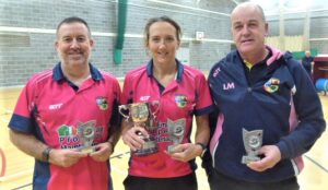 Saturday December 10th: The 5th of this years County Championships, the TRIPLES, saw 24 entries (same as last season) taking part. This meant an even round robin of 6 groups of 4 which resulted in the elimination of the bottom 8. The 6 group winners and the next best 10 then entered the last 16 – the first KO round, which eliminated another 8 leaving the final 8 to play in the Quarter Finals. The results of these were all very close as follows.