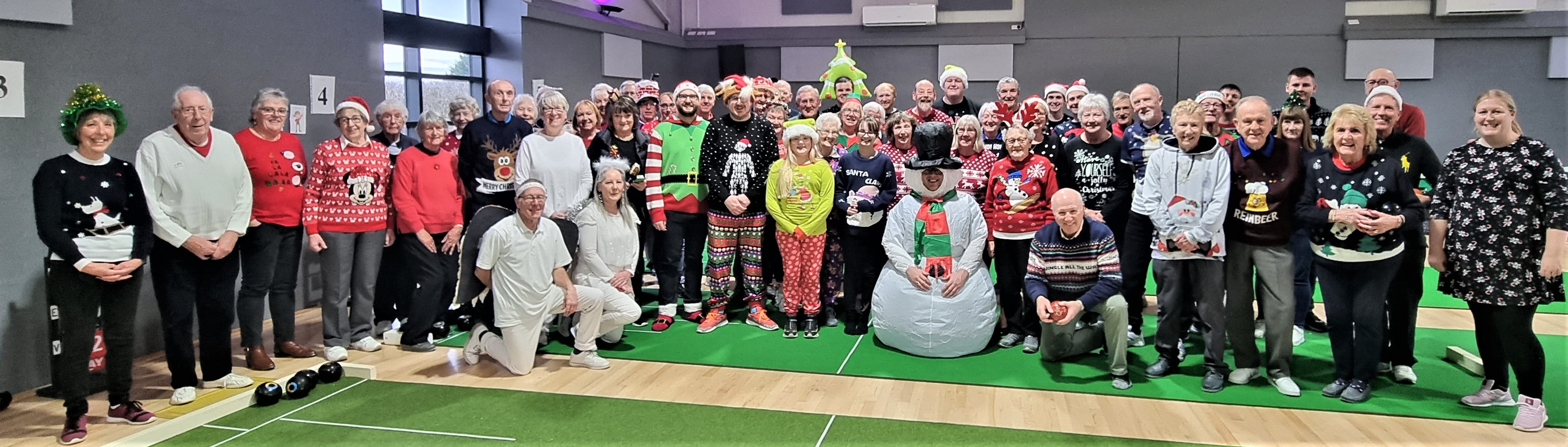 The annual Christmas Triples at Bubwith was attended by around 50 jolly bowlers all dressed for the occasion in Christmassy gear, including James Clark who spent the day hiding inside a full Snowman’s suit. The team that was judged best overall were the Angels from Thornton Le Dale (Angel at Islington, Angel of the North and Angel Delight).
