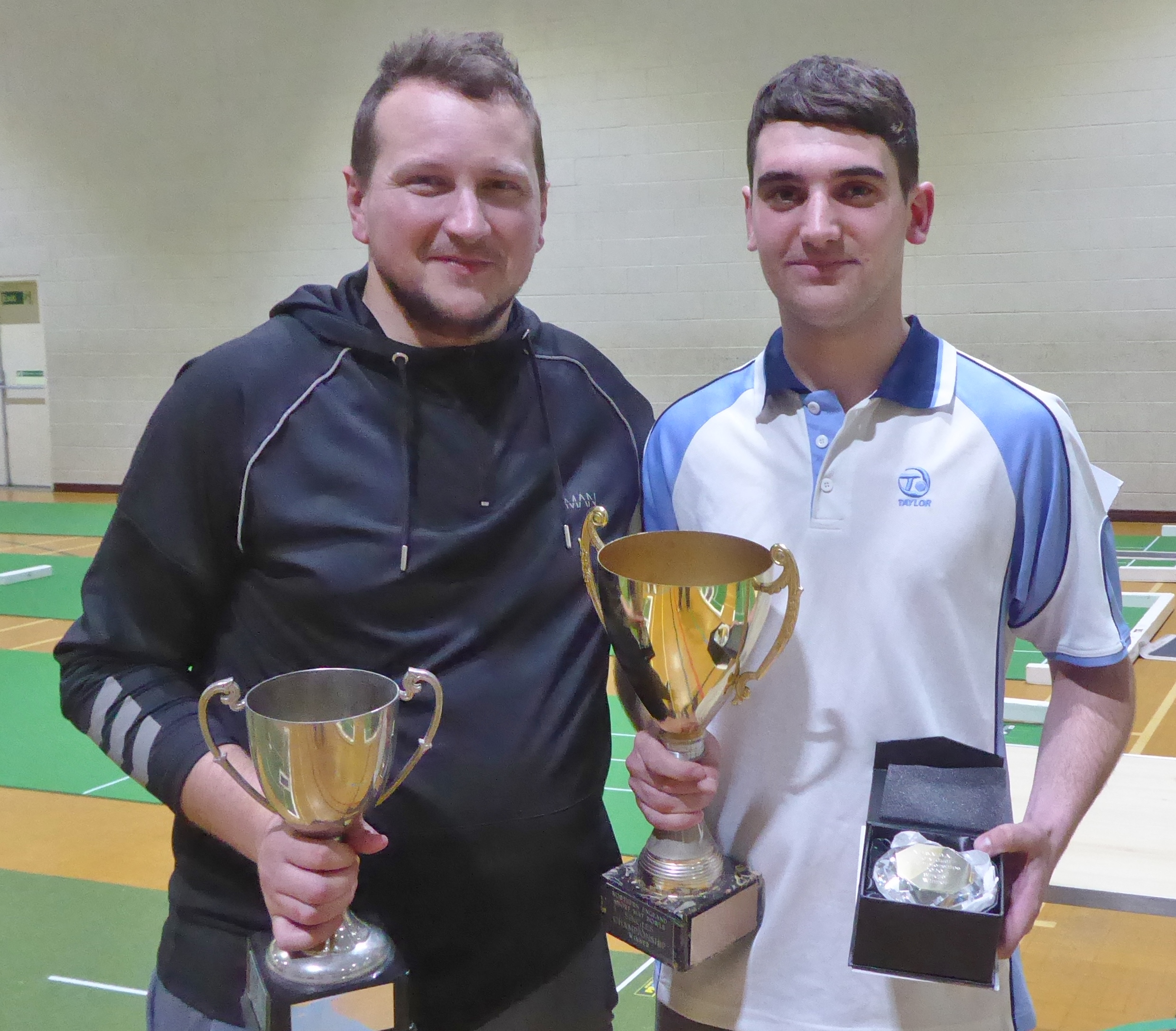 SINGLES: Although they each lost one of their round robin games, 3 of our 5 finalists went through to the knockouts. Steve Duffin immediately found himself drawn against last years champion Adam Lamb from Staffordshire but undaunted, saw him off with a 11-6 win. However he then found himself drawn against West Yorkshire’s Royston Lewis, a 3 times former champion and this proved to be his downfall after a 2-11 defeat. David Brown was drawn to play Derbyshire’s Ivan Lunn, who had won the Singles twice before. A closely fought battle was won 8-7 after David drew a great final wood to the ditch line to secure victory. Another close match followed against Humberside’s Josh Burrow but this proved to be his final game after a 6-8 defeat. Danny Langdon meanwhile sailed through the knockouts with wins over Humberside (13-3), Stockport (11-8) and the afore mentioned Royston (9-2) to reach the Final. Here he played Kevin Siddle, a finalist twice before but never a winner. Danny’s relentless and accurate drawing put Kevin into attack mode but few of his weighted woods got a result. Danny finally won the match 14-5 with an end to spare to regain the trophy he first won 3 years ago.